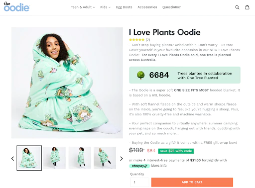 Así es como el minorista The Oodie comienza la descripción del producto para su I Love Plants Oodie en el primero de nuestros ejemplos de descripción del producto.