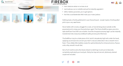 Así es como Firebox despierta su imaginación con una descripción de su Fizzics DraftPour. Muestra cómo el producto resuelve los problemas comunes de ir al pub a tomar una pinta.
