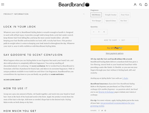 Beardbrand, por ejemplo, no describe la calidad de su bálsamo para peinar como excelente. En cambio, describen cada detalle más su beneficio.