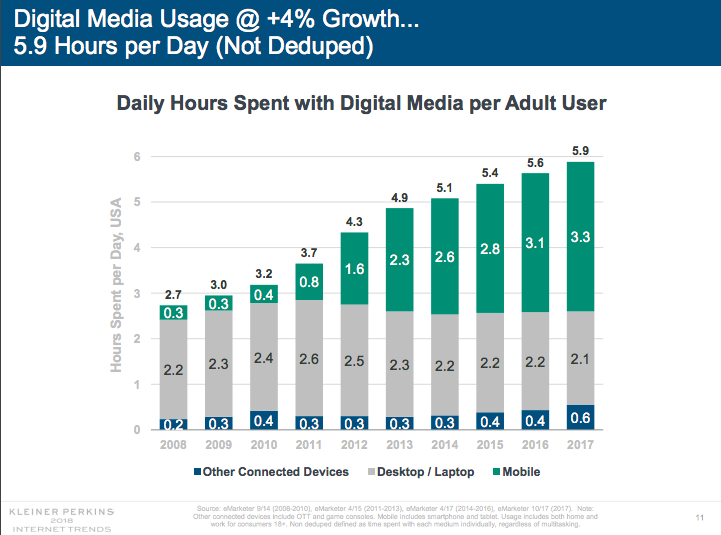 Publicado: 2018-06-01Todas las últimas tendencias forman parte del informe Tendencias de Internet de Mary Meeker (presentación completa incluida al final de esta publicación) cada año y no podíamos ignorar los cambios en el uso de medios, el consumo de dispositivos móviles, la búsqueda por voz y todas las innovaciones que cambian nuestras vidas. .