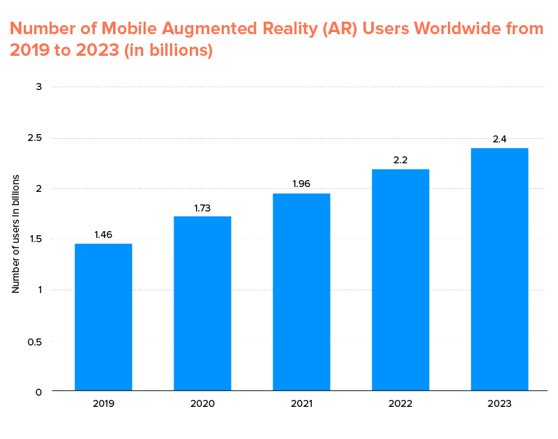 Según un informe más reciente , para 2021, se estima que habrá 1960 millones de usuarios móviles de AR en todo el mundo. Y para 2023, se estima que el número crecerá a 2.400 millones de usuarios móviles de AR en todo el mundo.
