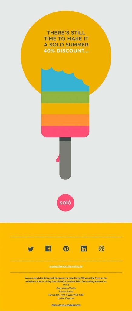 Por lo tanto, alimenta este "miedo". Cree exageraciones directamente en las líneas de asunto utilizando palabras que entusiasmen al usuario con una sensación de "oportunidad imperdible". Transfiera este sentimiento dentro del mensaje a través de copias estratégicas y visuales, como lo hace Solo con esta imagen expresiva, con un tema perfectamente veraniego de un carámbano casi derretido: