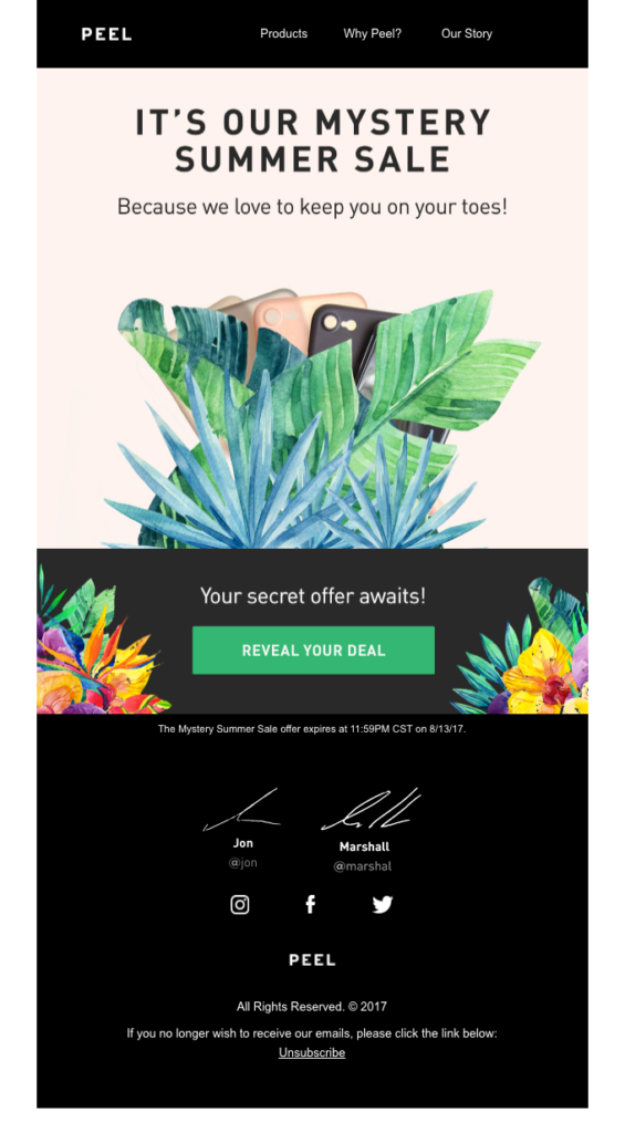 La fuerza de esta campaña radica en la curiosidad que despierta la misteriosa oferta de la marca. Las imágenes perfectamente temáticas ocultan el asunto de la promoción. Es probable que esto empuje al usuario a hacer clic en el botón CTA y descubrir más detalles. La paleta de colores ofrece matices vibrantes que se destacan sobre dos fondos neutros y contrastantes (beige y negro). Esto también le da al correo electrónico un toque veraniego manteniendo un estilo limpio y sobrio.