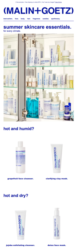 Facilite la vida de sus contactos y gane su confianza y lealtad a largo plazo. Además de ofrecer descuentos y promociones en tus productos, da rienda suelta a tu creatividad con ideas y sugerencias . Complete sus DEM y boletines informativos con eventos, actividades y experiencias de los meses de verano, listas de tareas pendientes de viajes o proyectos y kits de supervivencia de verano que incluyen una selección de sus productos o consejos de viaje. En otras palabras, hágase útil. Aconseje cómo afrontar mejor esta temporada sin dejar de ser coherente con su mercado objetivo . Mire Malin + Goetz, una marca de belleza y cuidado personal. Lo hicieron con un paquete de productos imprescindibles para el verano.