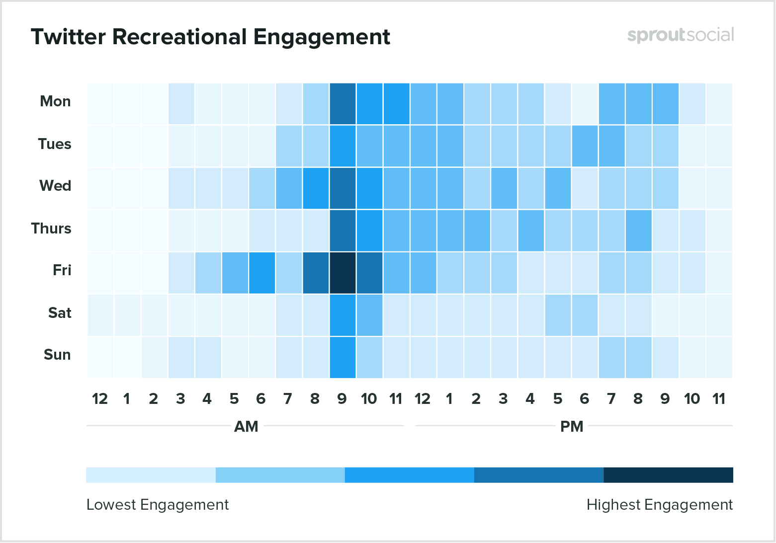 Meme si nos resultats suggerent que beaucoup de marques se concentrent moins sur Twitter que sur d'autres reseaux sociaux dans cette industrie, vous ne devriez pas manquer l'occasion d'interagir directement avec votre base de fans dedies et d'etendre votre portee a un nouveau public. En plus des heures de pointe que nous avons identifiees le vendredi, il ya un engagement constant survenant tous les jours a 9h. Dans le meme temps, l'engagement le plus faible est observe pendant le reste de la journee le samedi et le dimanche.