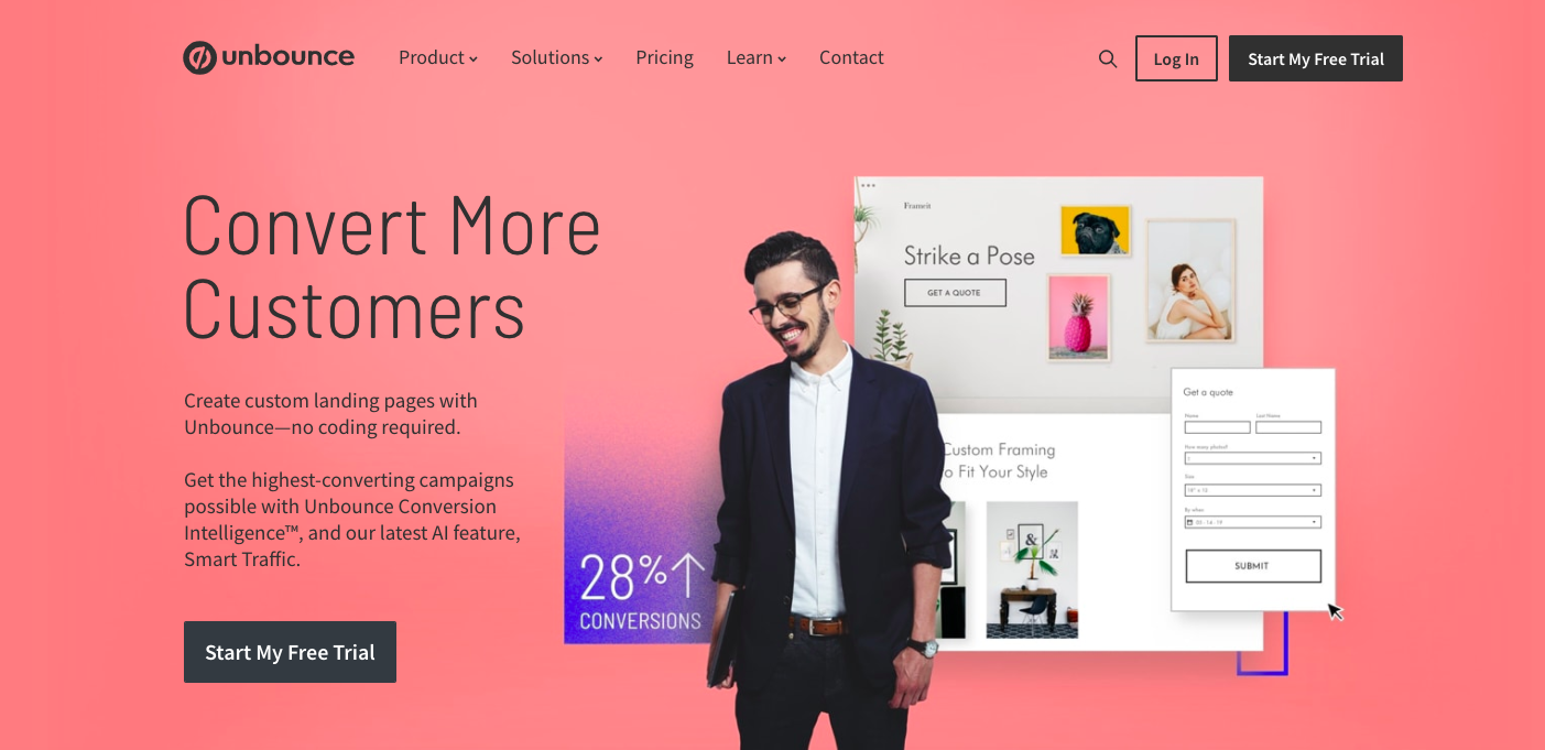 Unbounce fue uno de los primeros creadores de páginas de destino que ha visto el mundo del marketing digital. A diferencia de Clickfunnels, esta herramienta está más enfocada a crear módulos de aterrizaje y pre-aterrizaje de calidad que los propios embudos. Significa que no puede crear sus programas de afiliados aquí, sino que tiene amplias oportunidades de creatividad y expresión. Unbounce ayuda a los especialistas en marketing a crear y optimizar páginas de destino para conversiones y comunicarse con sus clientes potenciales de una manera más eficiente.