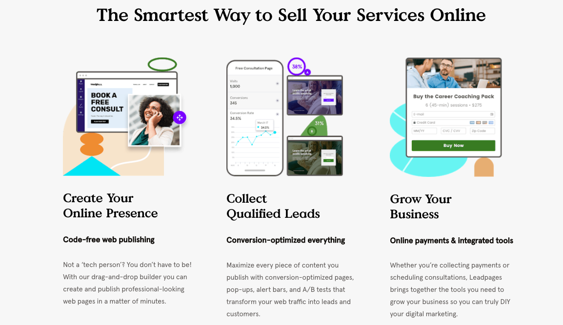 En cuanto al valor proporcionado a los clientes, Leadpages es básicamente lo mismo que Unbounce. La única diferencia es su público objetivo. Si bien Unbounce prefiere trabajar con especialistas en marketing digital, agencias y grandes empresas con experiencia, intente ayudar a las pequeñas empresas a crear sitios web, páginas de destino, ventanas emergentes, barras de alerta y otras cosas para conectarse con su audiencia, recopilar clientes potenciales y cerrar ventas.