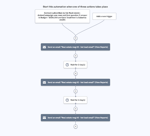 - ActiveCampaign puede etiquetarlos de inmediato como 'suburbio de prospectos calientes' en función de su presupuesto ($ 500K + en la pregunta n. ° 2) y los resultados generales del cuestionario ("¡Suburbia espera!").