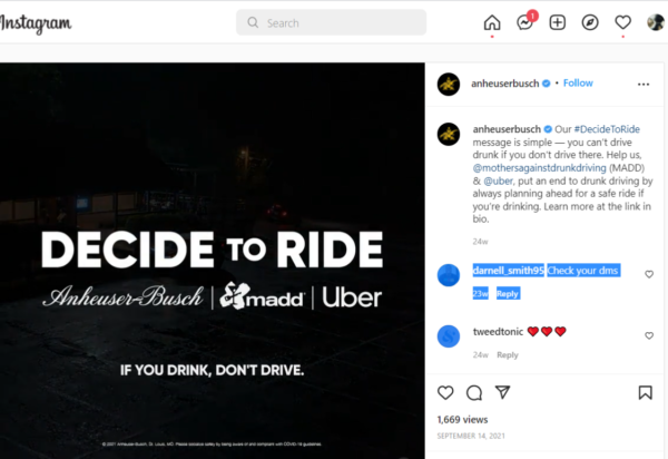 Anheuser-Bush también comparte contenido en Instagram usando #DecidetoRide. En asociación con Uber y Mothers Against Drunk Driving (MADD), los esfuerzos alientan a los consumidores a llamar a un servicio de transporte compartido si han estado bebiendo alcohol durante las celebraciones navideñas.
