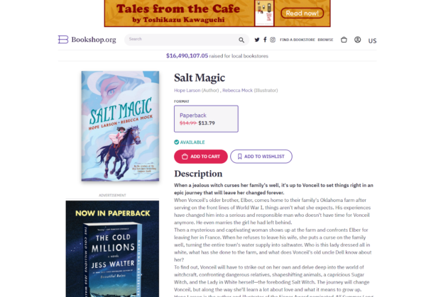 Cuando haces clic en el anuncio, te lleva a la página del libro en Bookshop.org. Esa página de destino también alberga anuncios contextuales, que muestran promociones de libros como "Bewilderment" y "The Cold Millions".