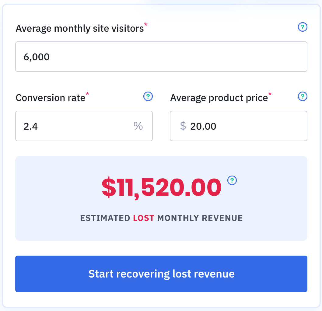 Si 6000 compradores visitan su sitio cada mes, su producto promedio cuesta $ 20 y ve una tasa de conversión promedio de 2.4%, probablemente esté perdiendo más de $ 11k por mes en carritos abandonados.