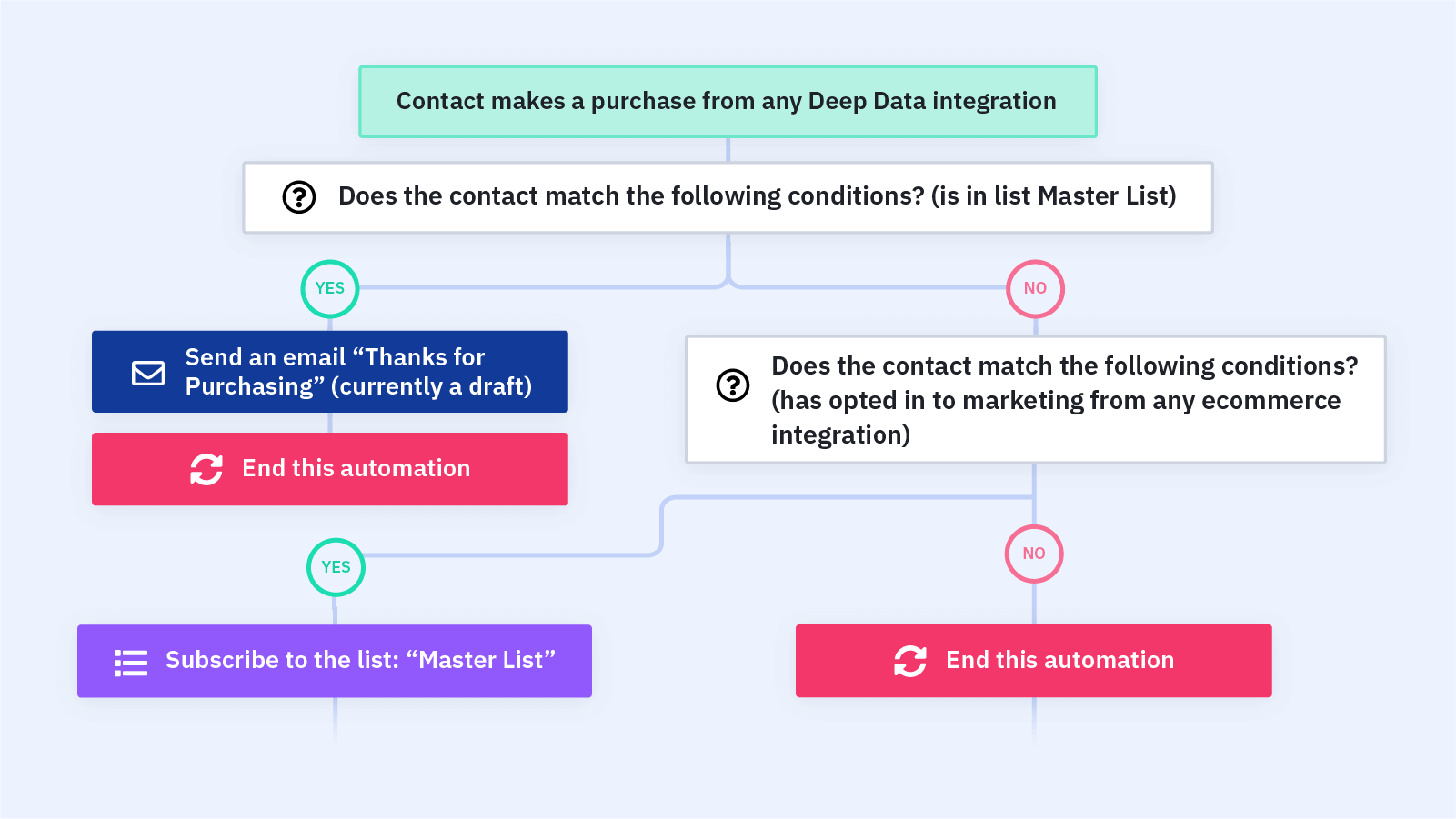 Cuando un contacto se suscribe a una lista, ingréselo automáticamente en una serie de correos electrónicos de bienvenida con esta automatización. Obtenga la Receta de Automatización de la Serie de Bienvenida aquí.