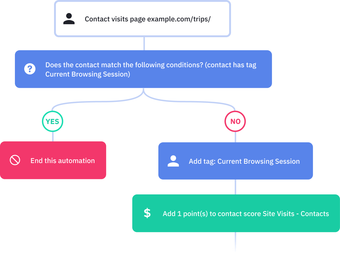 Cuando un contacto visita una página específica en su sitio web dentro de un rango de fechas específico, agregue puntos a su puntaje de puntaje de plomo. La puntuación de esta automatización le permite ver qué tan comprometido está el contacto, luego use esta puntuación para activar otras automatizaciones. Obtenga la puntuación de contacto para la receta de automatización de visitas al sitio aquí.