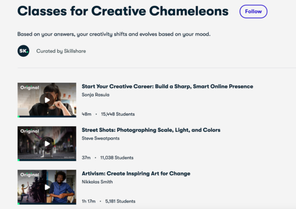 Después de hacer clic en las respuestas que le hablan en el cuestionario de Skillshare, hay un llamado a la acción que lo lleva a una página de destino. Allí no solo verás qué tipo de creativo eres sino también todos los cursos que ofrecen que son perfectos para ti.