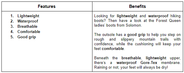 La copia de la página del producto es una parte importante del contenido de su tienda. Lo primero que debe recordar es tener siempre en cuenta las necesidades del comprador, y esa necesidad es información sobre sus productos. Las páginas de productos deben educar (características) y motivar a sus clientes (beneficios) para convertir.