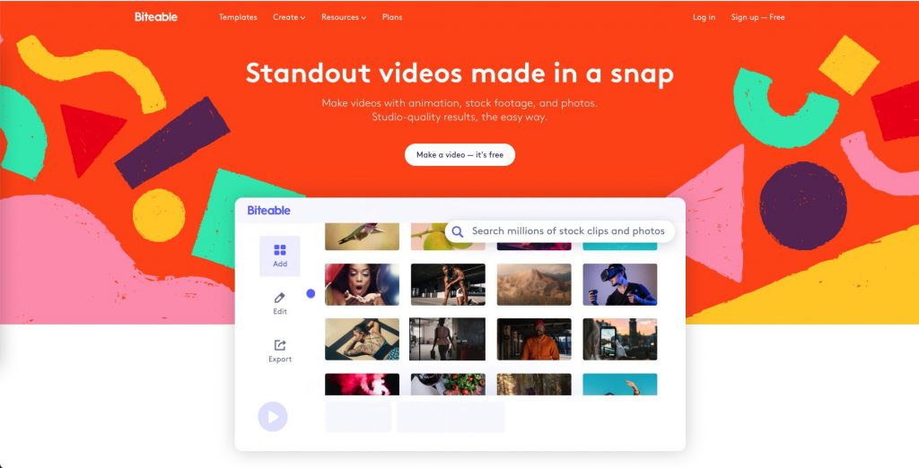 Biteable ofrece clips de video de archivo y plantillas que puede usar para crear anuncios de video estelares de comercio electrónico de manera rápida y fácil. La plataforma está basada en la nube, como otras de nuestra lista, e incluye las herramientas necesarias para crear presentaciones, videos y anuncios para las redes sociales. El plan gratuito es bueno, pero la actualización a un plan premium elimina las marcas de agua, le brinda una marca personalizada, derechos de uso comercial, video HD y más.