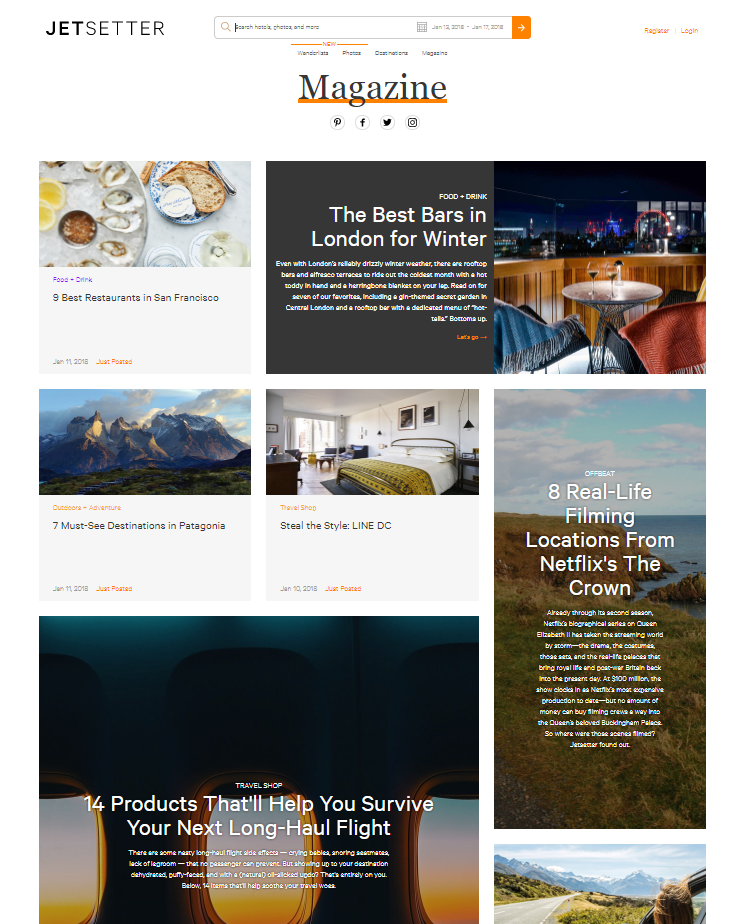 Jetsetter, por ejemplo, con su Revista ofrece contenido seleccionado y de calidad que incluye noticias sobre destinos culturales , atracciones , gastronomía , diseño y accesorios de viaje .