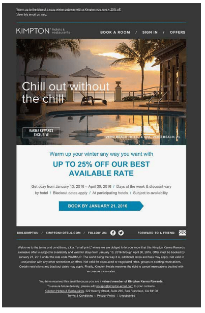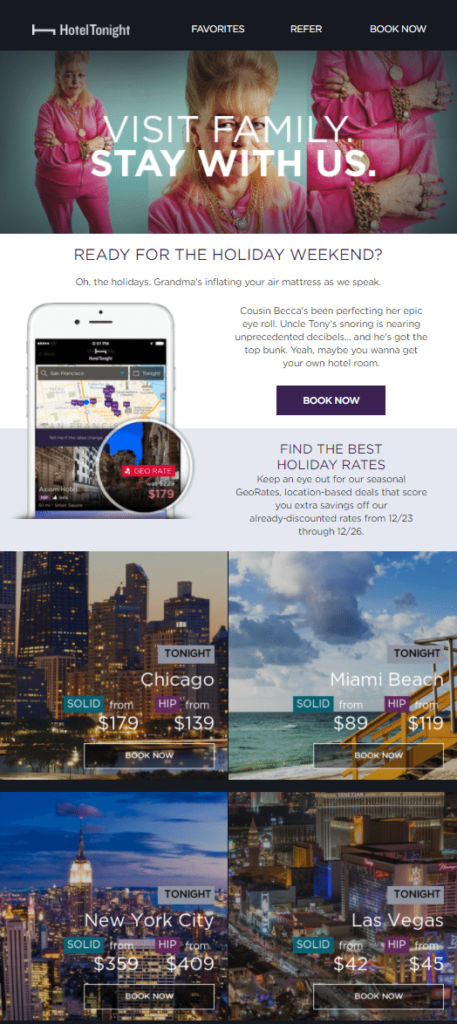 El enfoque de una empresa como HotelTonight es bastante diferente. En el siguiente correo electrónico, el foco ya no es la ubicación, sino el precio . Es un correo electrónico para todos aquellos cuyo presupuesto dicta el destino, y no al revés.