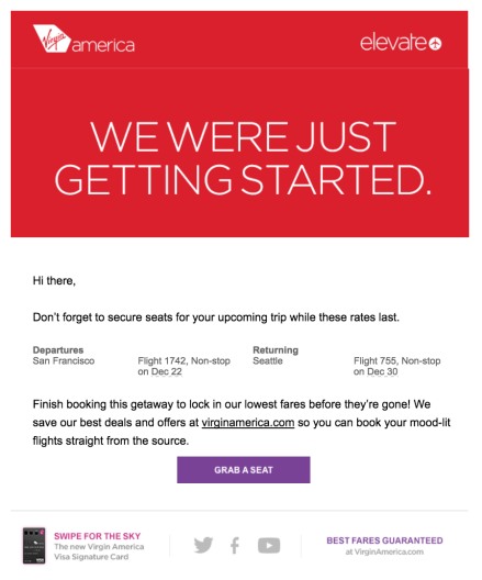 Estos son todos aquellos correos electrónicos que utilizan las marcas del sector de viajes y turismo para proponer ofertas y servicios que están conectados con el viaje que el cliente acaba de reservar. Una aerolínea puede obtener mejoras al ofrecer asientos más cómodos: