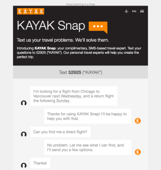 La planificación de viajes puede resultar estresante para los clientes. Es por eso que adoptar un canal aún más inmediato puede ser la mejor manera de administrar las actividades de soporte. Kayak lo hace bastante bien: