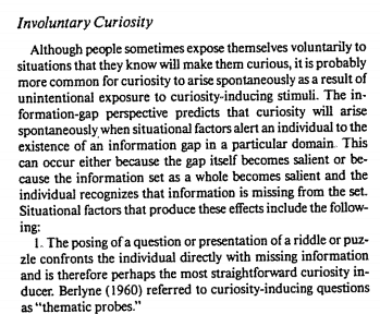 El documento es un gran análisis de la investigación psicológica sobre la curiosidad: tiene 24 páginas y ha sido citado más de 1400 veces.