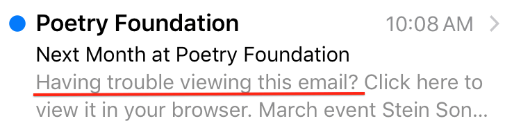 "Teniendo problemas" es el primer texto en el correo electrónico real, por lo que es lo que aparece en el preencabezado. Nada en contra de Poetry Foundation, pero un preencabezado más descriptivo podría aumentar sus tasas de apertura. (También podría ser peor: a veces aparece un enlace para darse de baja aquí).