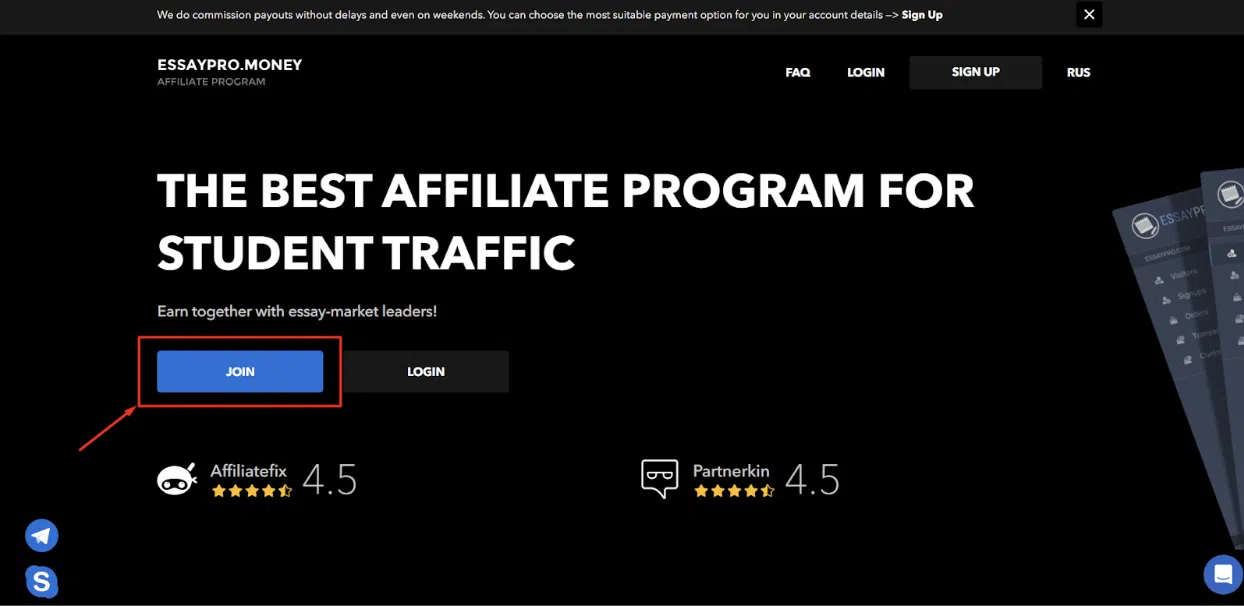Paso – 1: Vaya al sitio web oficial del Programa de afiliados de EssayPro.Money desde aquí y haga clic en 'ÚNETE'.