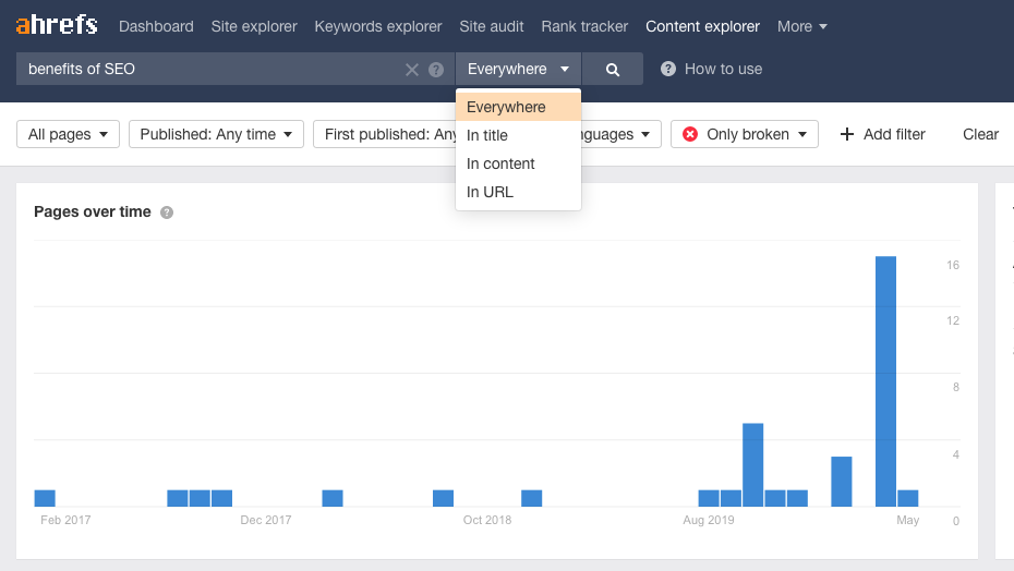 El explorador de contenido de Ahrefs es su propio motor de búsqueda. Es similar a Google en la producción de resultados, sin embargo, puede filtrar los resultados para encontrar exactamente lo que necesita. Utilizando el explorador de contenido, escriba su palabra clave para producir una lista de resultados de búsqueda. En este ejemplo, la palabra clave es “beneficios del SEO”.