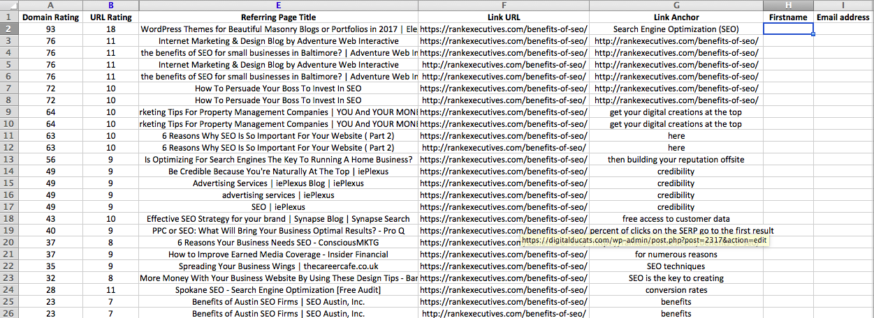 Extraiga sus direcciones de correo electrónico de destino para cada uno de sus prospectos de enlaces rotos en su grupo. Incluya el nombre y la dirección de correo electrónico en su hoja de cálculo maestra para que su alcance sea lo más eficiente posible.