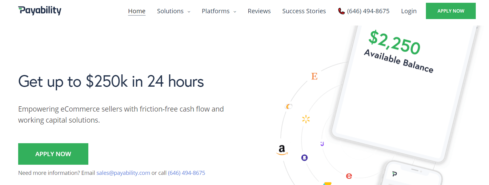 Payability proporciona soluciones de financiación diseñadas para las necesidades únicas de Amazon y las empresas de comercio electrónico. Sus soluciones incluyen Instant Advance (avances de capital de hasta $250,000) e Instant Access (pagos diarios acelerados para vendedores pagados en términos de mercados como Amazon). La aprobación de la Pagabilidad se basa en el estado de la cuenta y el rendimiento de las ventas, por lo que no hay verificaciones de crédito ni papeleo complicado, simplemente conecte su tienda y obtenga una oferta dentro de las 24 horas.