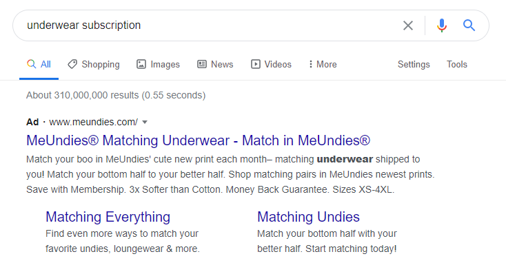 Al buscar "suscripción a ropa interior", aparece este anuncio: