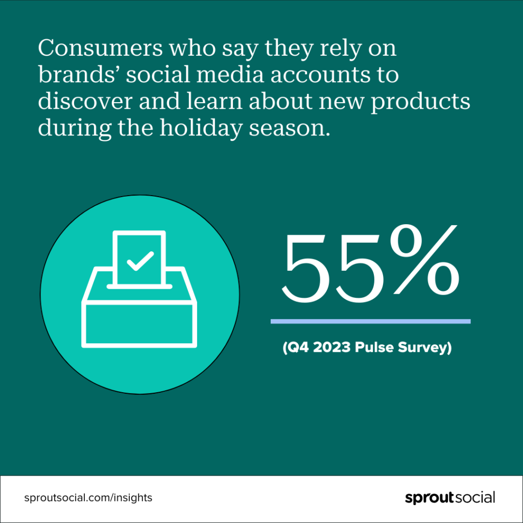 Las redes sociales son un centro comercial virtual diseñado para el descubrimiento de productos, la prueba social y la compra, todo en un solo lugar. Y los consumidores también lo saben: el 55% de los consumidores dicen que confían en las cuentas de redes sociales de las marcas cuando se trata de descubrir y conocer nuevos productos durante la temporada navideña, según nuestra encuesta Pulse del cuarto trimestre de 2023.