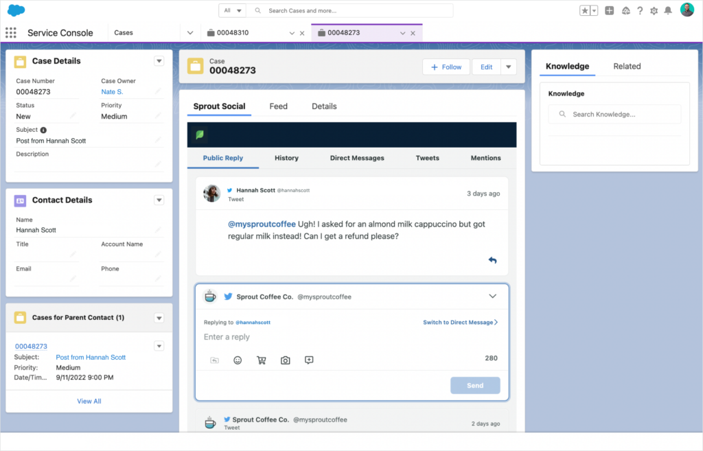 Por ejemplo, la integración de Salesforce de Sprout permite a los usuarios aprovechar los datos sociales para una experiencia de atención omnicanal de clase mundial. Permite a sus equipos de atención reunirse con los clientes donde están en lugar de enviarlos a otros canales, como una línea telefónica o un correo electrónico.