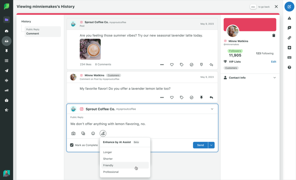 Las herramientas de IA crean un punto de partida para respuestas que su equipo puede aprovechar, minimizando el esfuerzo; tener estas herramientas integradas en su flujo de trabajo actual agiliza aún más su proceso. Enhance by AI Assist de Sprout, por ejemplo, sugiere respuestas generadas por IA para que usted pueda elegir y personalizar al responder a comentarios sociales y mensajes directos. Incluso puedes seleccionar el tono que deseas que transmita tu respuesta.