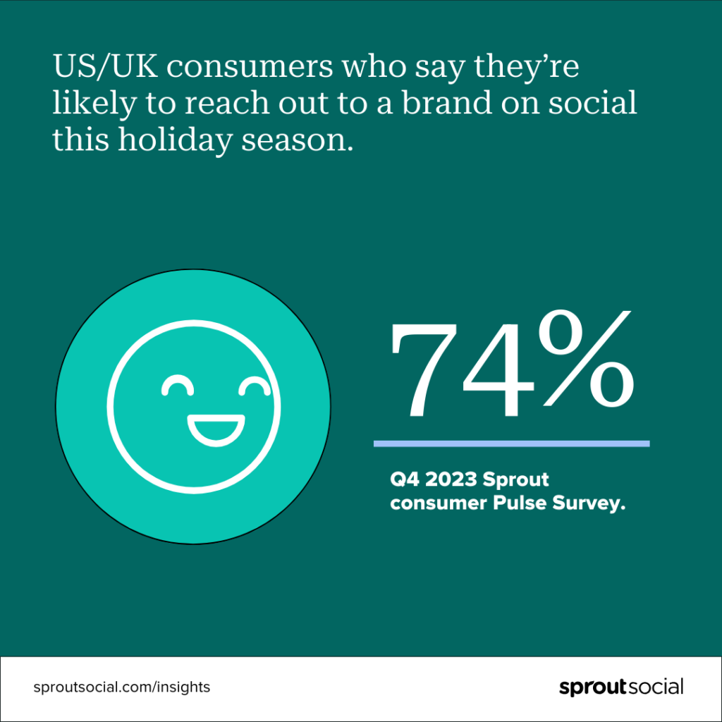 Responder las preguntas de los clientes en las redes sociales se encuentra firmemente en el centro del diagrama de Venn de las redes sociales y la atención al cliente. Tanto es así que el 74% de los consumidores de EE. UU. y el Reino Unido dicen que es probable que se acerquen a una marca en las redes sociales esta temporada navideña, según una encuesta de Sprout Pulse del cuarto trimestre de 2023 realizada a 1.623 consumidores.
