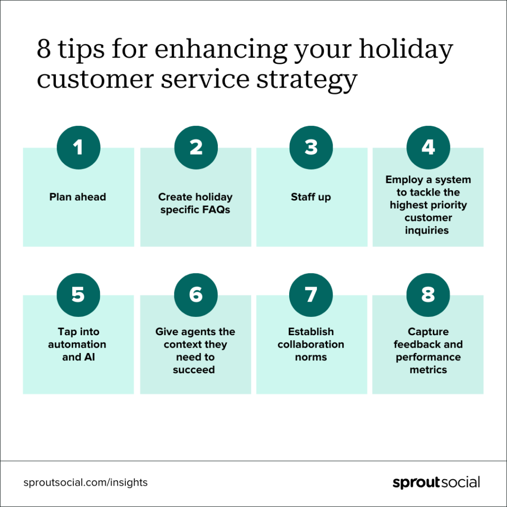 Si desea revisar y revisar los procesos de su equipo antes de que llegue la prisa, aquí hay ocho consejos para mejorar su estrategia de servicio al cliente durante las fiestas y algunas formas en que Sprout puede ayudarlo en el camino.