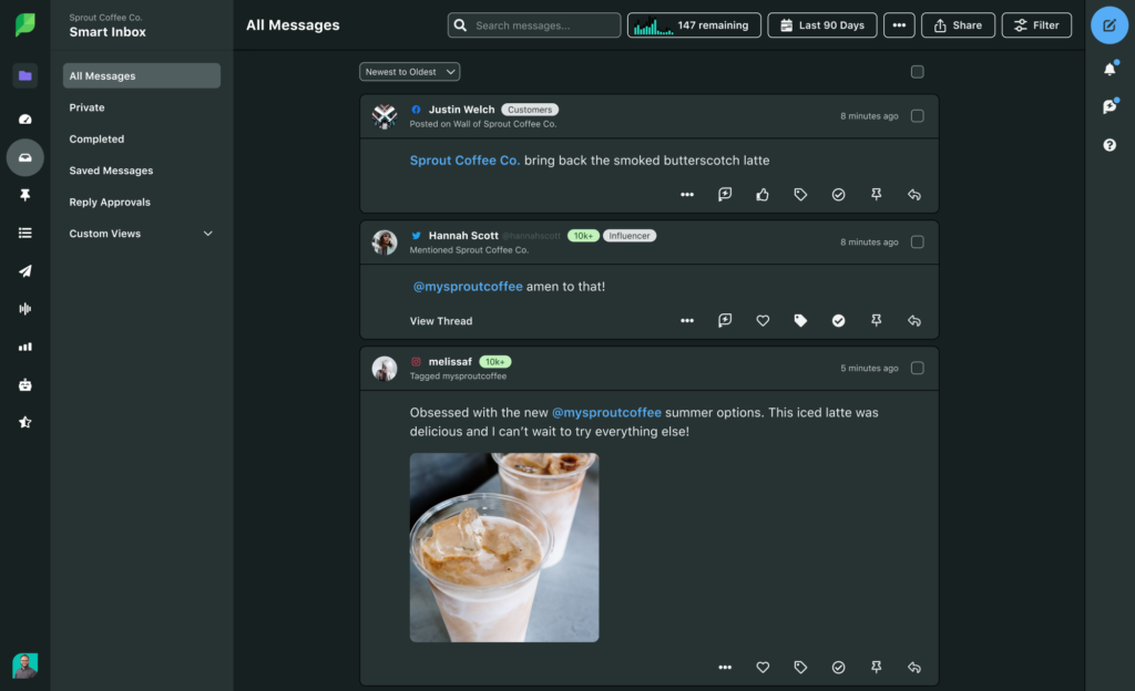 Para reducir aún más la confusión, utilice la función Conversaciones de Sprout. Esto centraliza las conversaciones del equipo dentro de la Bandeja de entrada inteligente, de modo que las preguntas se pueden responder sin correos electrónicos adicionales ni mensajes directos de ida y vuelta.