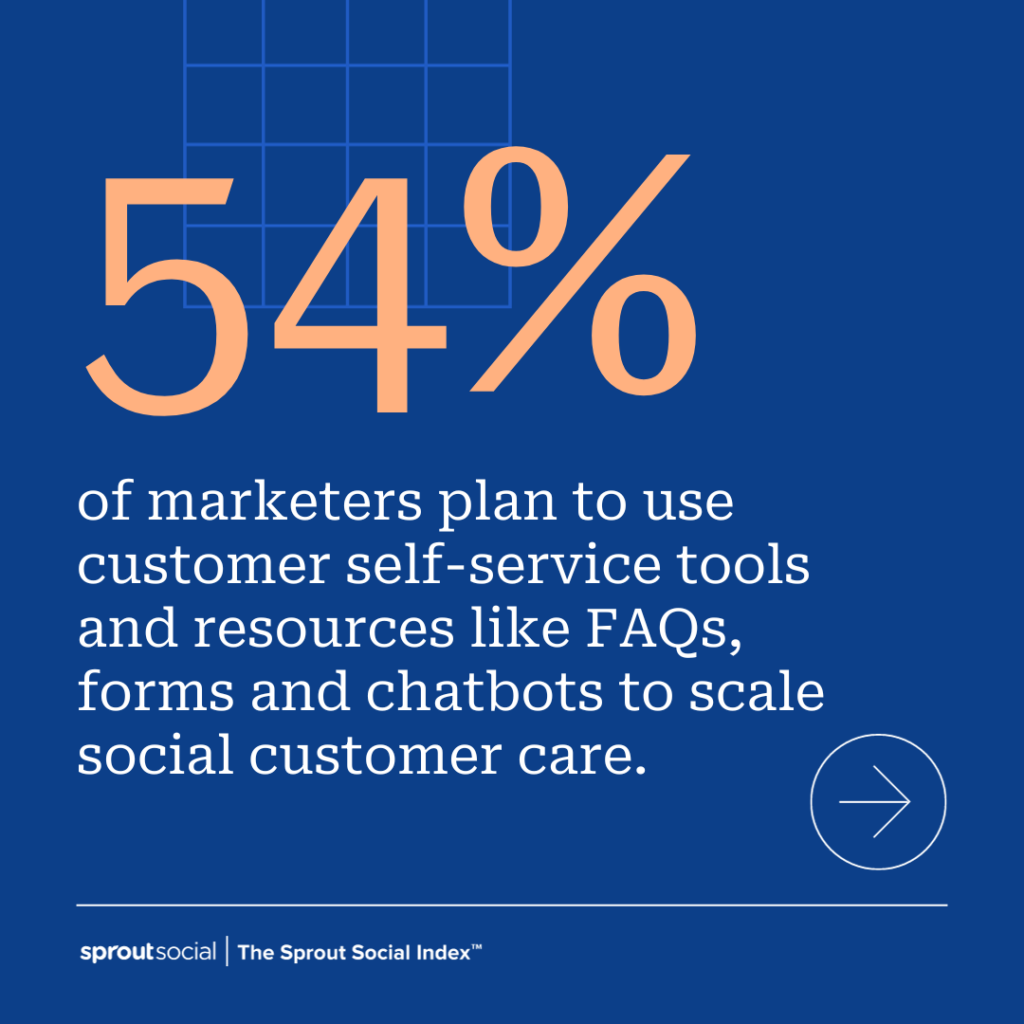 Según el Índice, el 54% de los especialistas en marketing planean utilizar herramientas de autoservicio para el cliente, como las preguntas frecuentes, para escalar la atención al cliente en las redes sociales. Agregue preguntas frecuentes específicas de vacaciones a su sitio, chatbots (más información a continuación) o incluso publique subtítulos para que los clientes puedan encontrar las respuestas por sí mismos.