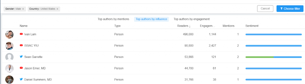 El uso de una herramienta de monitoreo de redes sociales le permitirá revisar miles de personas influyentes, encontrar aquellos que se enfocan en los temas que son relevantes para usted, luego filtrar los que tienen altas tasas de participación en lugar de solo toneladas de seguidores falsos o pasivos, y tomar decisiones informadas sobre sus futuras colaboraciones.