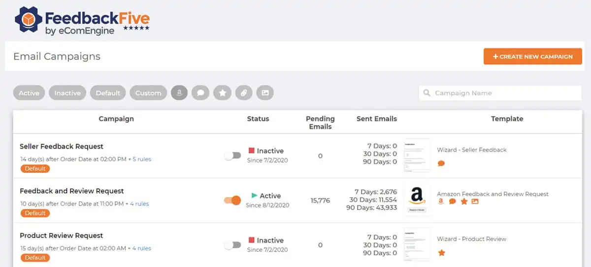 Una de las herramientas más reconocidas en la industria es FeedbackFive de eComEngine, que envía solicitudes de revisión automatizadas de Amazon en su nombre. Puede elegir entre mensajes de comprador-vendedor de marca personalizada o el mensaje oficial de solicitud de revisión de Amazon.