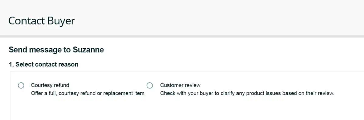 Disponible solo para los vendedores del Registro de marcas, el enlace Contactar al cliente le permite enviar mensajes directos a los compradores que han dejado reseñas críticas (de 1 a 3 estrellas) con correos electrónicos de mensajes de comprador-vendedor que ofrecen un reembolso de cortesía o atención al cliente adicional.
