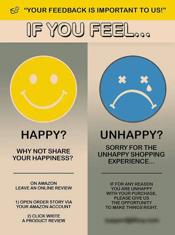 - Use insertos de productos para solicitar reseñas. Insertar una tarjeta en su empaque o caja de envío que solicite de manera neutral una revisión imparcial, completa con instrucciones, puede ayudarlo a llegar a clientes que normalmente no pensarían en dejar una revisión o que tal vez no sepan cómo hacerlo.