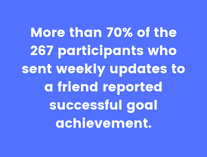 #1 Comparta su lista con otros : la rendición de cuentas es un gran motor de motivación. Un estudio encontró que más del 70 % de los 267 participantes que enviaron actualizaciones semanales a un amigo reportaron un logro de metas exitoso en comparación con solo 355 de los que no escribieron ni compartieron sus metas.