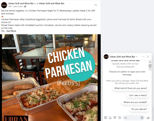 En este ejemplo, notará que Urban Grill and Wine Bar obtuvo una calificación de respuesta positiva en Facebook Messenger. La nota de que Urban "normalmente responde en una hora" les permite a los clientes saber que pueden esperar un servicio rápido. Responda rápidamente a sus clientes para fomentar la buena fe y ganar una atractiva insignia de capacidad de respuesta.