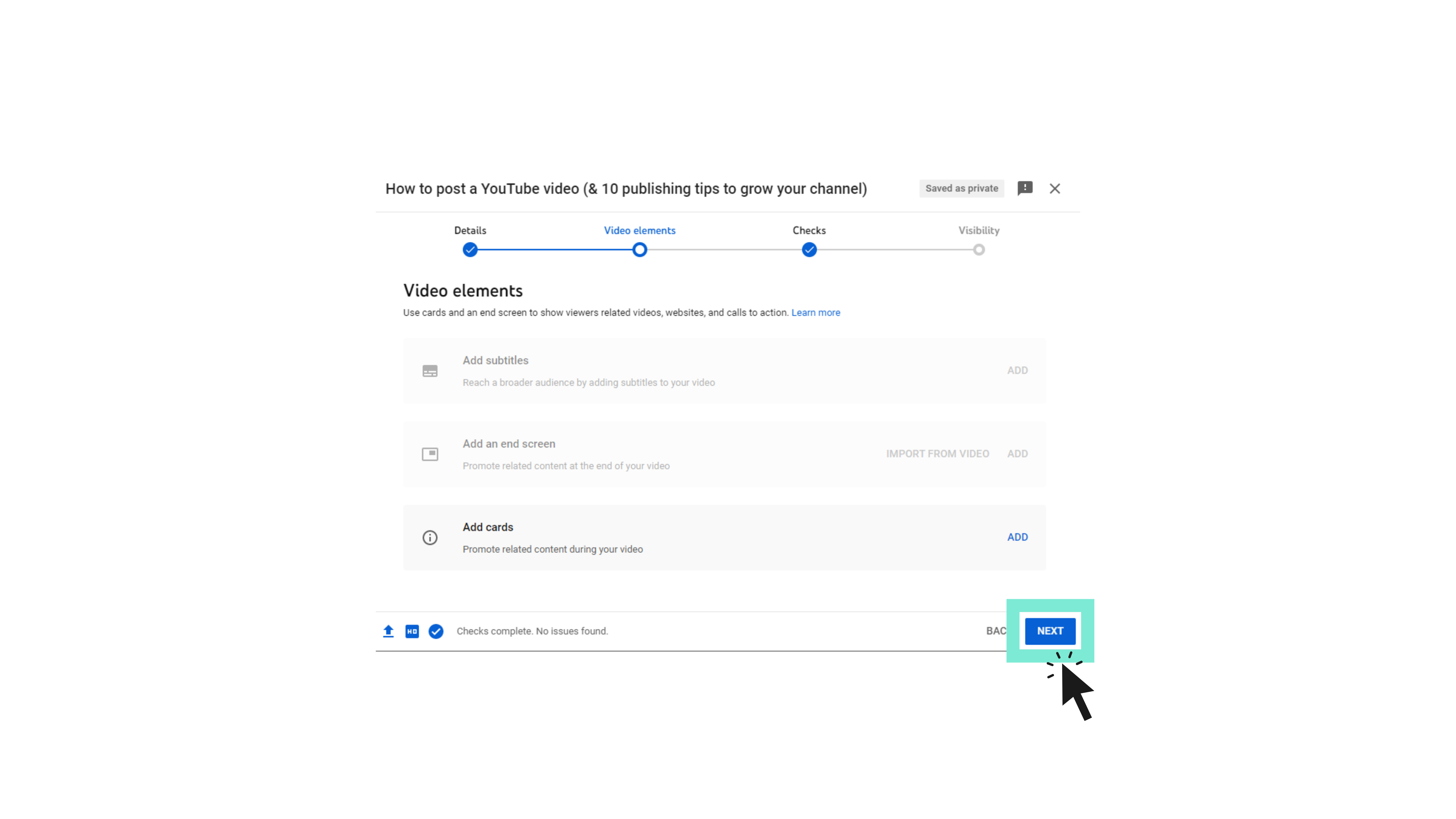- YouTube verifica automáticamente el contenido cargado en busca de problemas de derechos de autor. Si no hay ninguno, verá una nota en la esquina inferior de la ventana emergente que dice "Comprobaciones completas". No se encontraron problemas." Luego puede hacer clic en Siguiente .