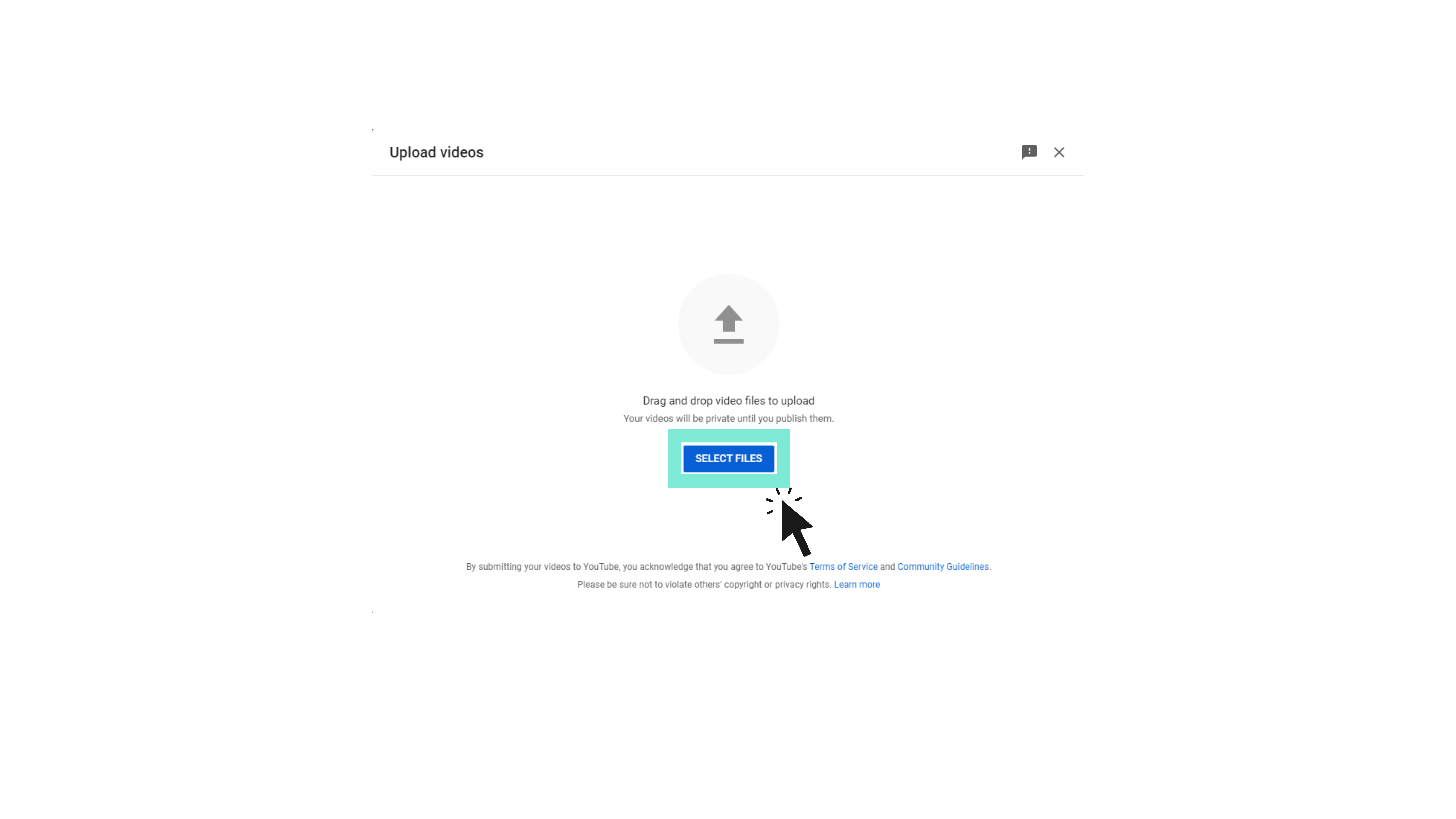 - Haga clic en Seleccionar archivos para abrir una ventana del explorador de archivos. Alternativamente, también puede arrastrar y soltar contenido en el cuadro emergente.