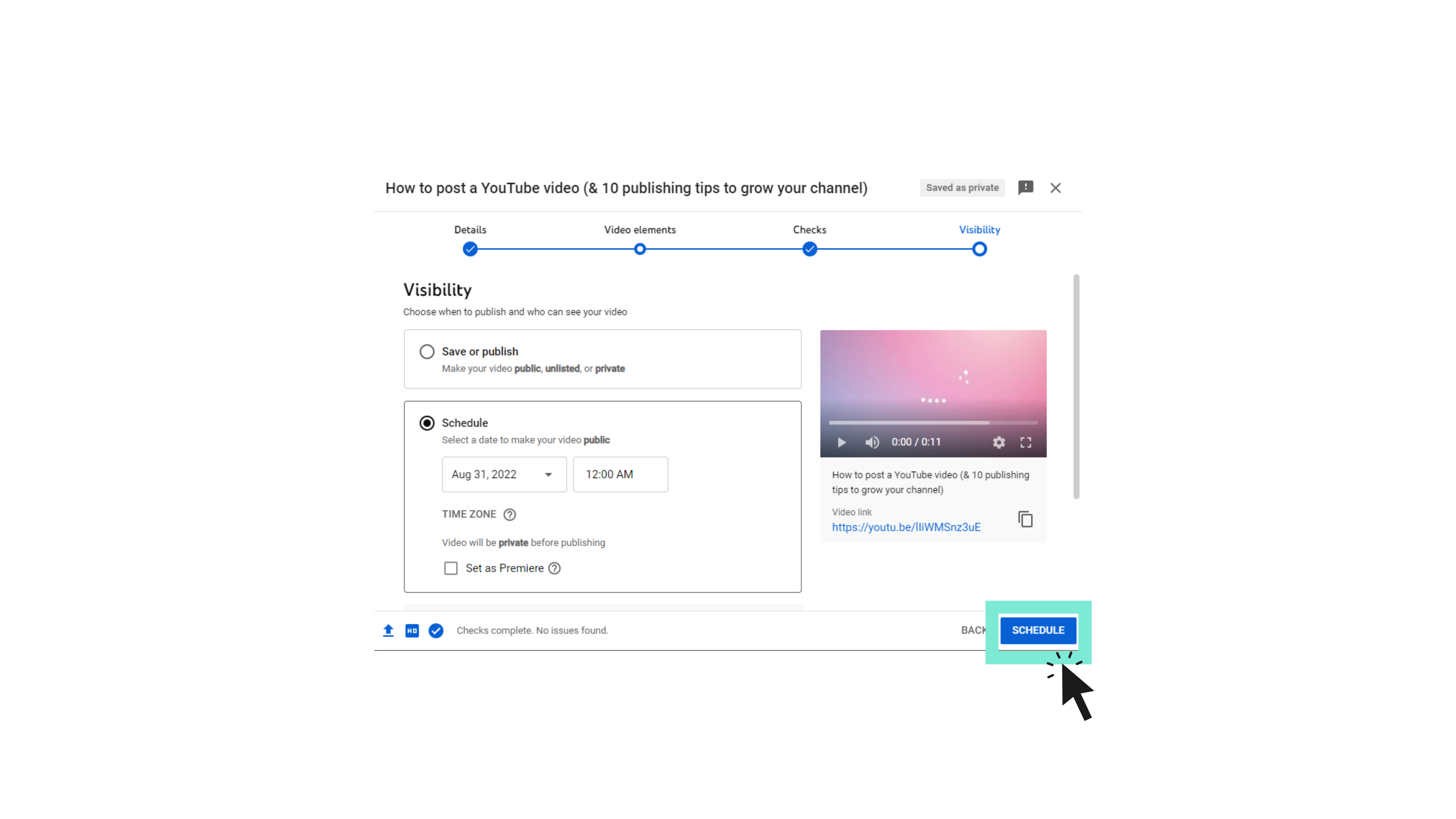 - Finalmente, haga clic en Público y luego en Publicar para completar el proceso. Si desea programarlo para publicarlo más tarde, haga clic en Programar y seleccione la fecha y la hora adecuadas antes de hacer clic en Publicar.