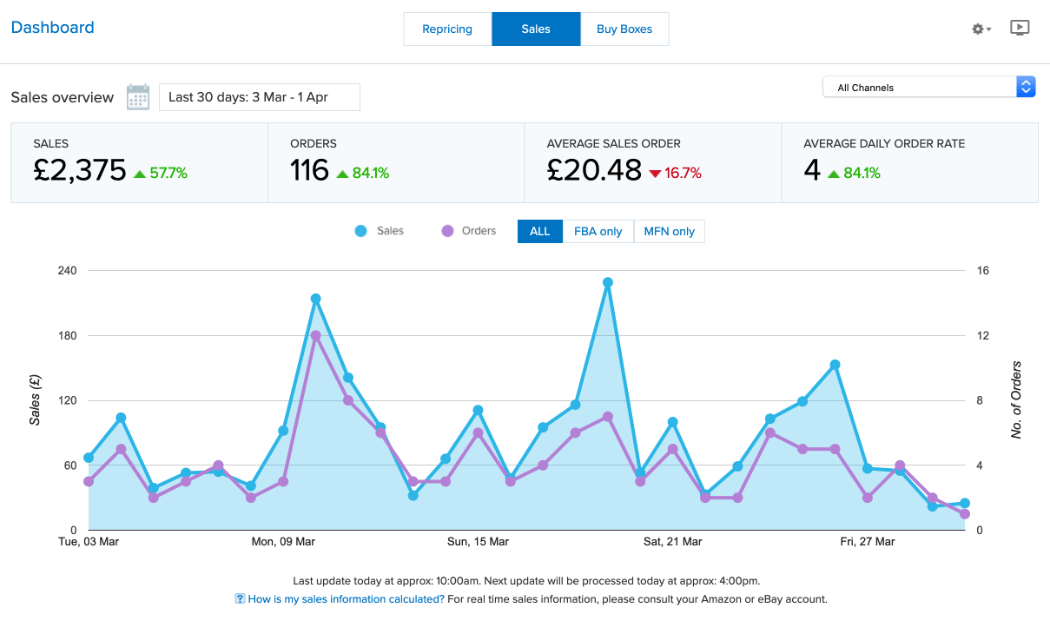 Independientemente de lo que venda, puede beneficiarse del uso de un repricer automatizado. No podemos prometerle que sus ventas aumentarán en un 79% durante la prueba, pero debería ver un aumento en las ventas, las ganancias y la propiedad de Buy Box al final de su prueba gratuita. Comience su viaje de revisión de precios hoy, no se requiere tarjeta de crédito.