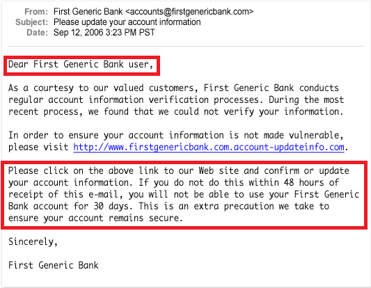 Como puede ver, el correo electrónico revela algunos de los signos más obvios de phishing: un saludo genérico, una solicitud de información personal y el uso de lenguaje amenazante.