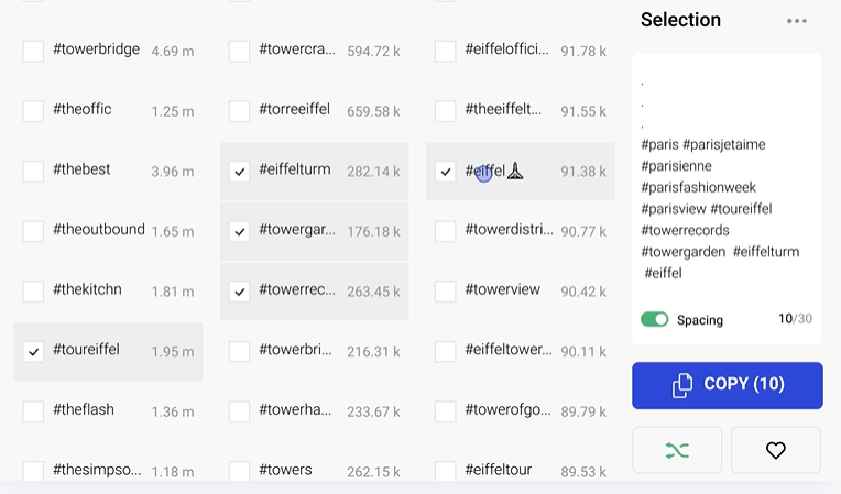 El generador de hashtags gratuito de Inflact utiliza una orientación avanzada de IA para crear una lista de posibles hashtags en función de las etiquetas existentes y los términos relacionados.